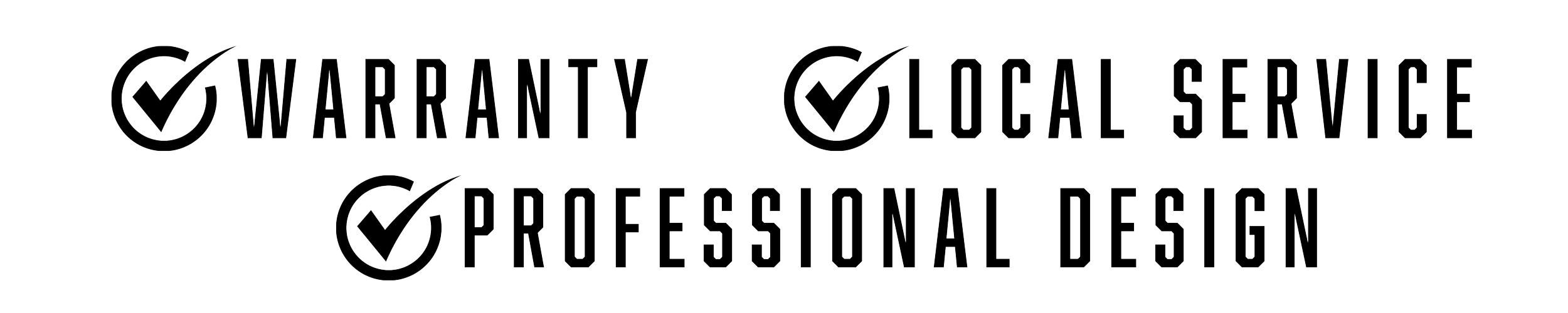 Icons with checkmarks next to the words "Warranty," "Local Service," and "Professional Design."